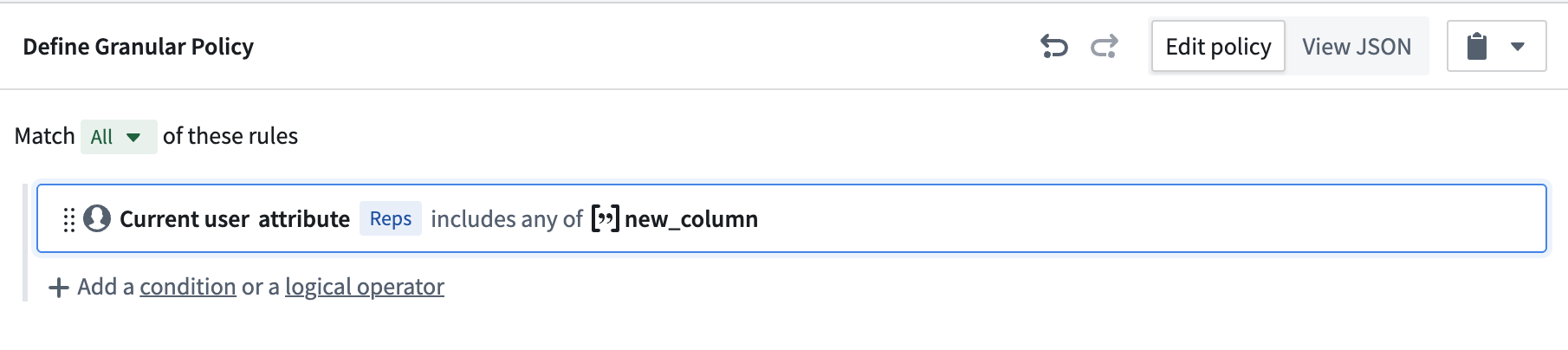 For example I would define a user attribute Reps where I could defined a set of Rep Codes by user would have access to. However, it seems that a custom user attribute does not support an attribute with an array. I would like to have an array for example on the user with values: A, G which would give the access to row 1 and 3.