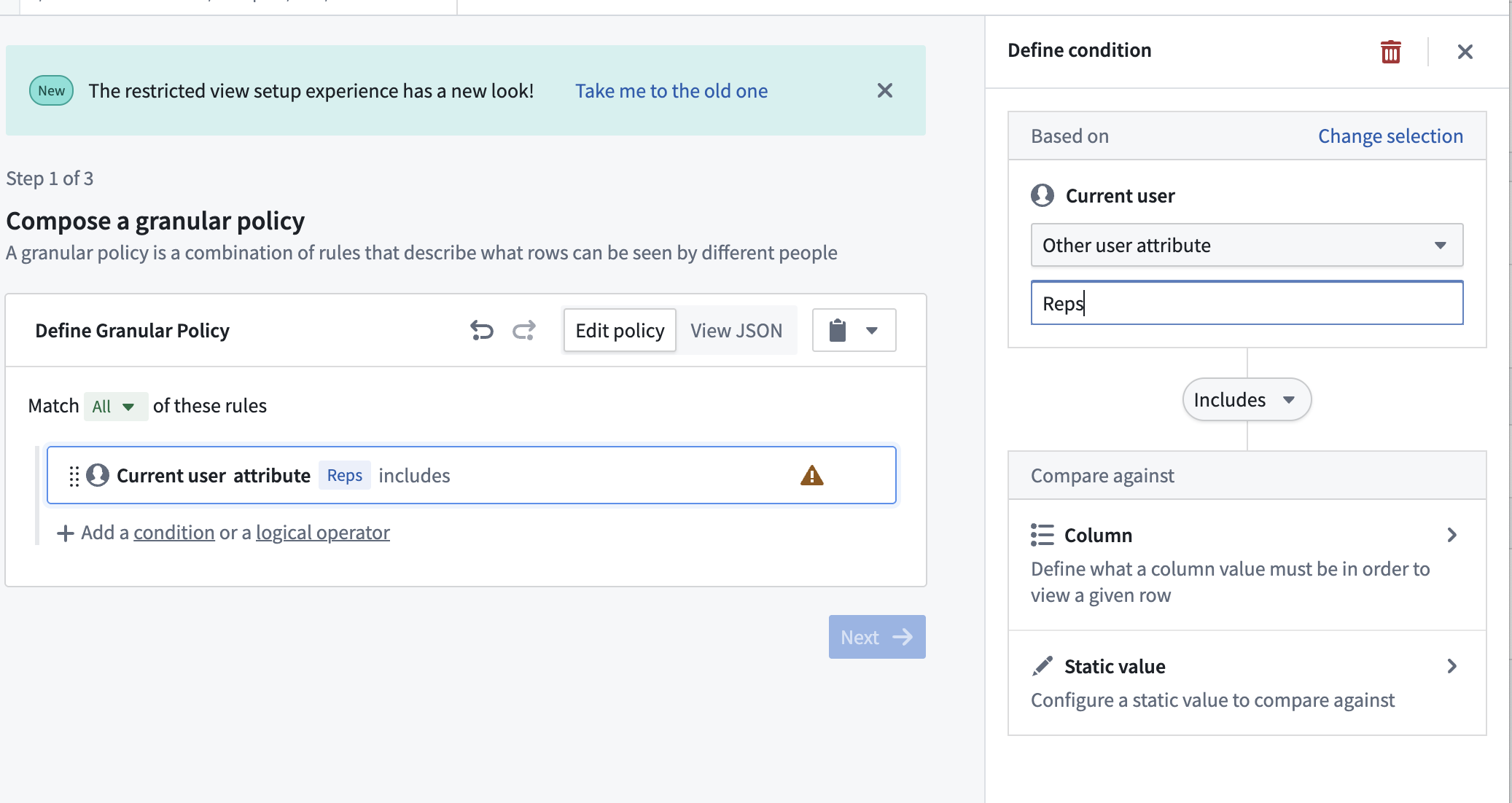 I need the ability to filter those rows by a user attribute which could have an array of those permissions.